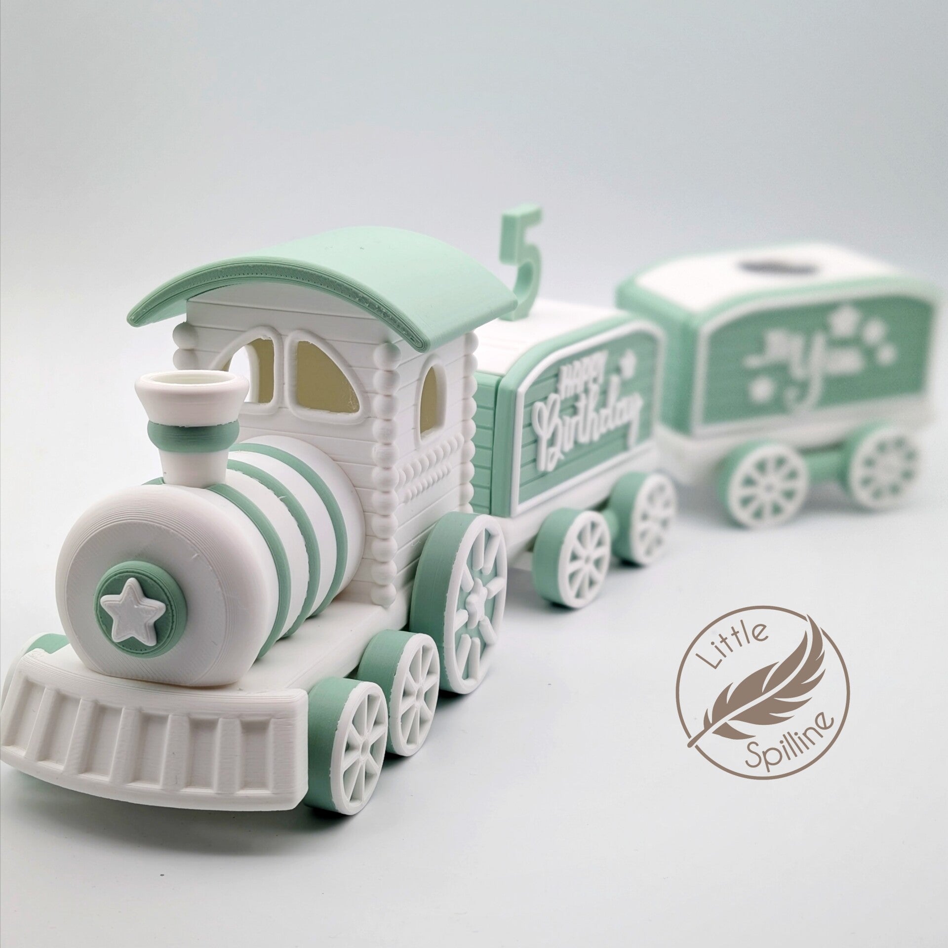 Ich habe diesen Geburtstagszug mit viel Liebe gefertigt, damit jeder Ehrentag zu etwas ganz Besonderem wird. Die kleine Lok mit zwei Wagons bietet Platz für eine Kerze sowie für die Zahlen 0–9, sodass der Zug jedes Jahr aufs Neue verwendet werden kann.