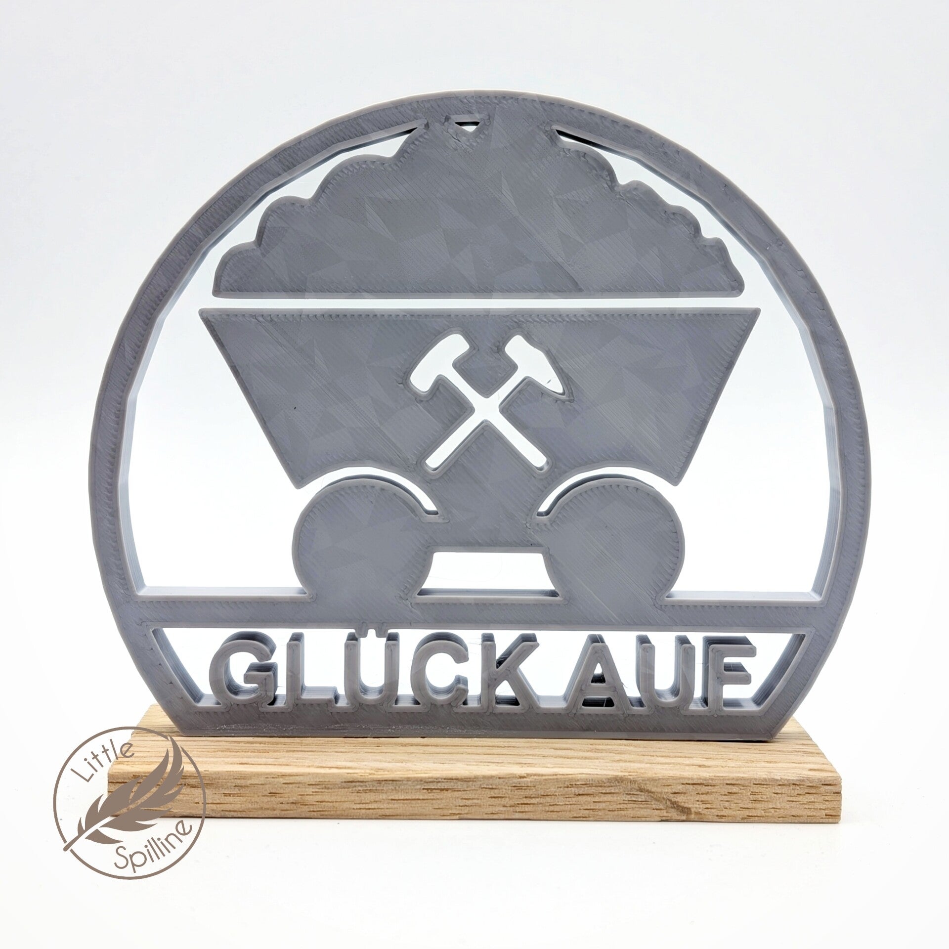 Ein Stück bergmännische Tradition modern interpretiert: Dieser Aufsteller aus dem 3D-Drucker auf stabilem Holzsockel ist in verschiedenen Motiven erhältlich – als Lore, Förderturm oder mit Hammer und Schlägel. Am unteren Rand trägt er stets den Schriftzug „Glück Auf“, das klassische Grußwort des Bergbaus.