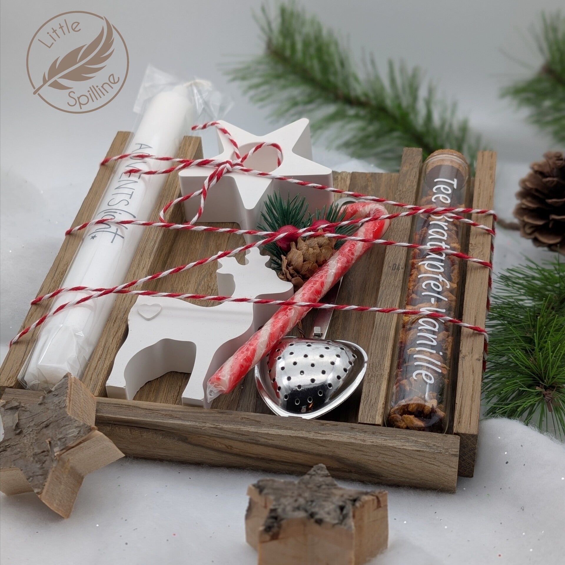 Ein Herz-Teeei und eine klassische Zuckerstange runden das Set ab und schaffen eine harmonische Kombination aus Genuss, Dekoration und Herzenswärme. Ein liebevolles Geschenk für die Adventszeit, das Freude schenkt und für eine behagliche, festliche Atmosphäre sorgt.