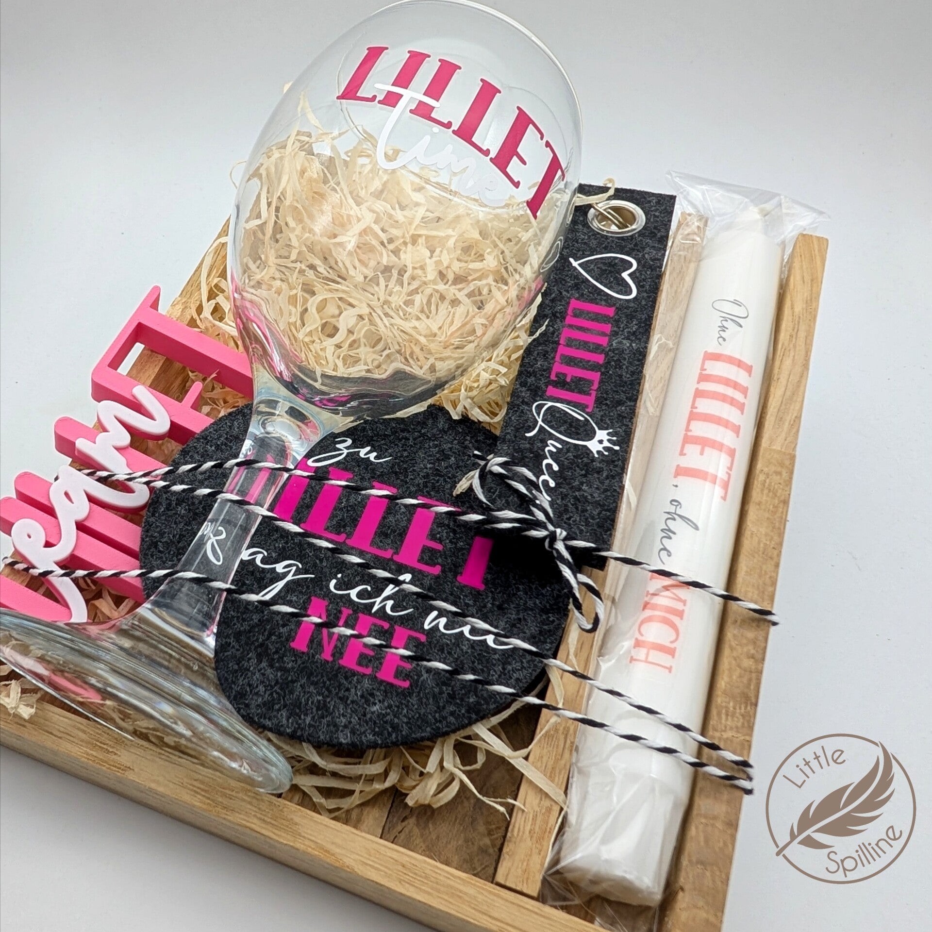 Elegant, stilvoll und mit einem Hauch französischem Flair: Dieses Lillet-Geschenkset ist eine besondere Aufmerksamkeit für alle, die feinen Aperitif-Genuss lieben. Auf einem edlen Holztablett ist jedes Element liebevoll arrangiert. Ein Lillet-Glas mit Plott, eine beschriftete Kerze, ein Schlüsselanhänger, ein Untersetzer sowie ein passender Deko-Schriftzug ergeben ein harmonisches Gesamtbild.